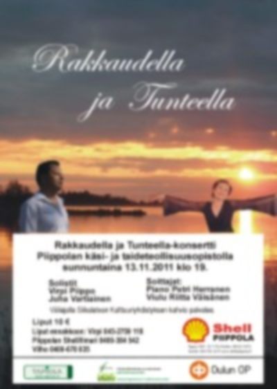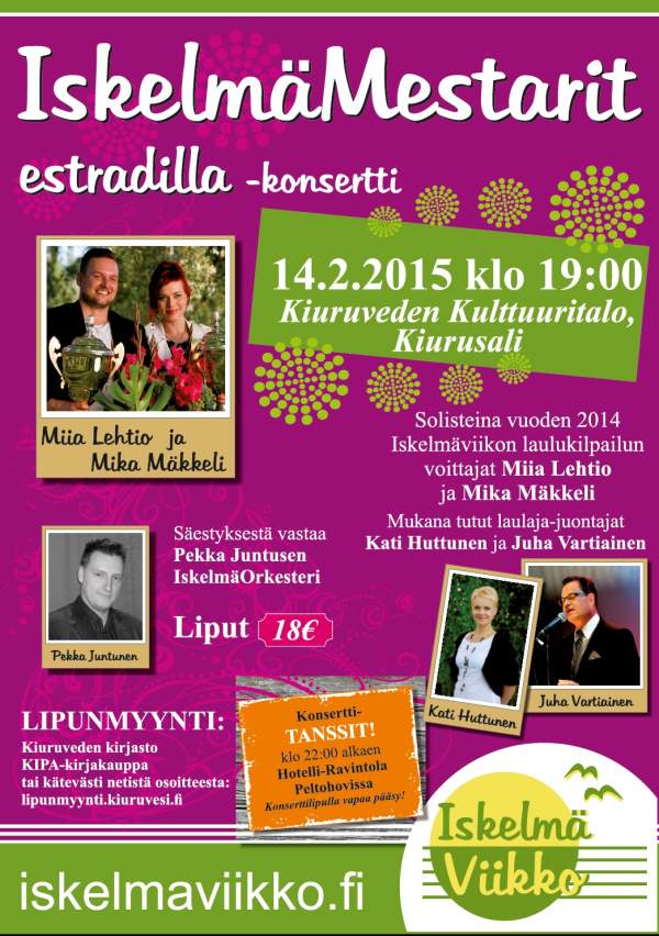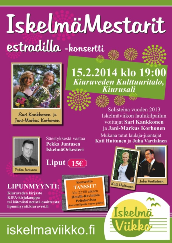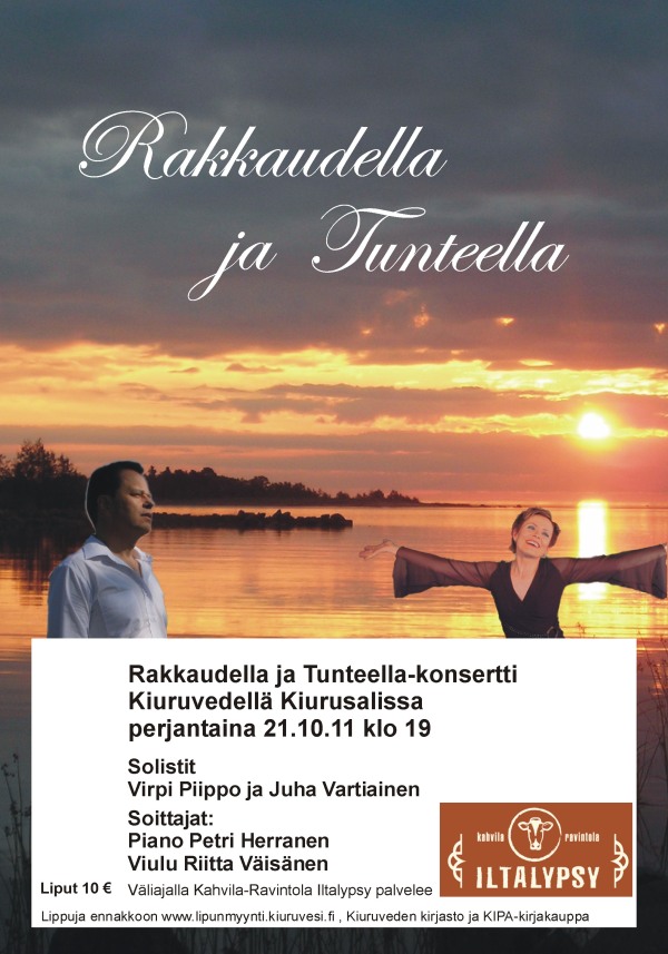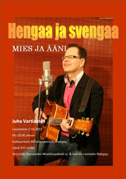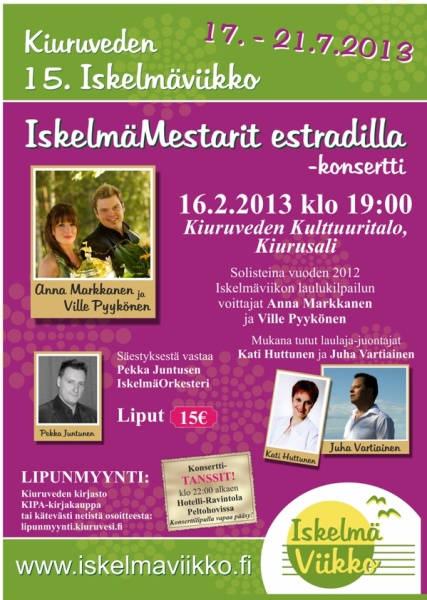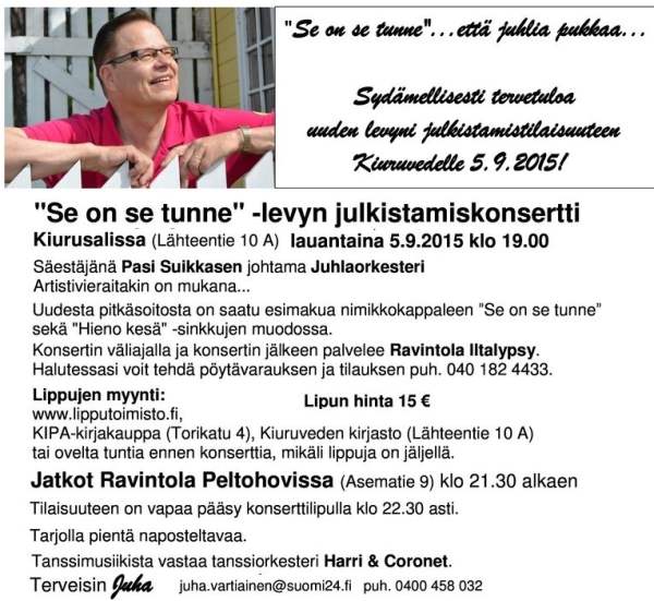 Sydämellisesti tervetuloa 20-v. Laulajan taivalta -konserttiin sekä uuden levyni julkistamistilaisuuteen Kiuruvedelle 19.5.2012 20-v. Laulajan taivalta -konsertti Kiurusalissa (Lähteentie 10 A) 19.5.2012 klo 18.00 Säestäjänä Variaatio-orkesteri juhlakokoonpanossaan Pasi Suikkasen johtamana Artistivieraitakin on mukana... Konsertin yhteydessä julkaistaan myös 20-v. Juhlalevy Lippujen myynti konserttiin alkaa 15.3.2012 osoitteessa: http://lipunmyynti.kiuruvesi.fi tai KIPA-kirjakauppa (Torikatu 4) ma-pe klo 9 - 17 ja la 9 - 13. Lipun hinta 20 € Konsertin väliajalla ja konsertin jälkeen palvelee Ravintola Iltalypsy. Halutessasi voit tehdä pöytävarauksen ja tilauksen puh. 040 182 4433. Jatkot Ravintola Peltohovissa (Asematie 9) klo 20.30 alkaen. Tilaisuuteen on vapaa pääsy klo 22.00 asti, yksityistilaisuus. EI JUHLAVASTAANOTTOA! Tarjoan juoman (olut/siideri/limppari) sekä pientä naposteltavaa (pähkinöitä, sipsejä). Tanssimusiikista vastaa tanssiorkesteri Helminauha & Markus Kokkonen. Majoitusmahdollisuuksia voi kysellä Sinisestä Helmestä. Hankaniementie 110, Kiuruvesi, puh. 017 757 120. 110 €/2 hh tai 85 €/1hh, lisävuode 33 € sis. aamupalan ja ilta- tai aamusaunan. Varattaessa mainitse ”Juhan konsertti". Hotellista on tarvittaessa kuljetus konserttiin ja jatkoille. Hotelli Peltohovin majoituskapasiteetti on jo täynnä. Toki voit tiedustella mahdollisia vapautuneita huoneita lähempänä konserttipäivää puh. 017 760 4600. Joenvarren Seurahuoneen majoitustilat valmistuvat myös toukokuussa. Tiedustele majoitustilannetta puh. 045 8941333 Voit tiedustella majoitusta myös Runnin kylpylältä, Iisalmen ja Pyhäsalmen hotelleista. Myös yksityismajoitusmahdollisuus (Iskelmäviikon majoituksia) on olemassa, tiedustelut: email: juha.vartiainen@suomi24.fi tai puh. 0400 458 032 Terveisin Juha J.K. Su 20.5.2012 klo 13.00 Hanuri ja Antti harmonikkakonsertti Kiurusalissa. Mukana Kultaisen harmonikan voittaja 2011 Marko Kotilainen, Mika Tarkkonen, Pentti Karjalainen, Johannes Hartikainen, Kiuruveden Harmonikkakerho Juonto, laulu: Juha Vartiainen Liput ovelta 10 €